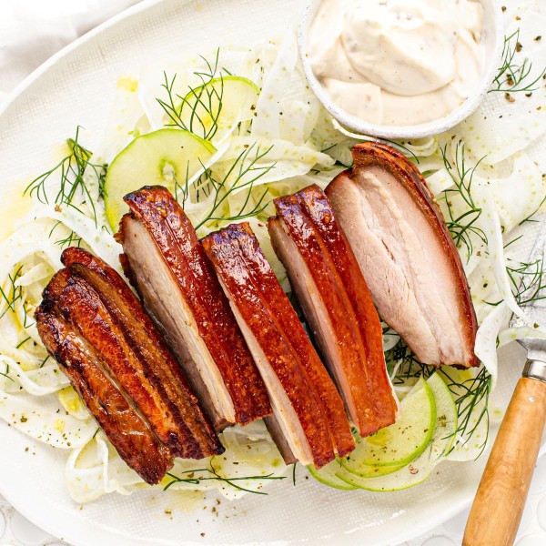 - To serve, place the green mango salad on a platter, spoon over some of the dressing. Slice the pork belly into large cubes, place on the salad along with the barbecued prawns, sprinkle over the crushed peanuts and fried shallots. Serve with the extra dressing.