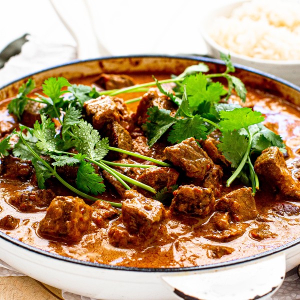 - Once all of the meat has browned add the ghee, onion and garlic and cook until golden and caramelised. Add the Korma paste, cook for a few minutes until fragrant. Add the beef stock, chopped tomatoes, coconut milk, cinnamon stick and brown sugar, Mix well to combine. Allow to come to a simmer.
