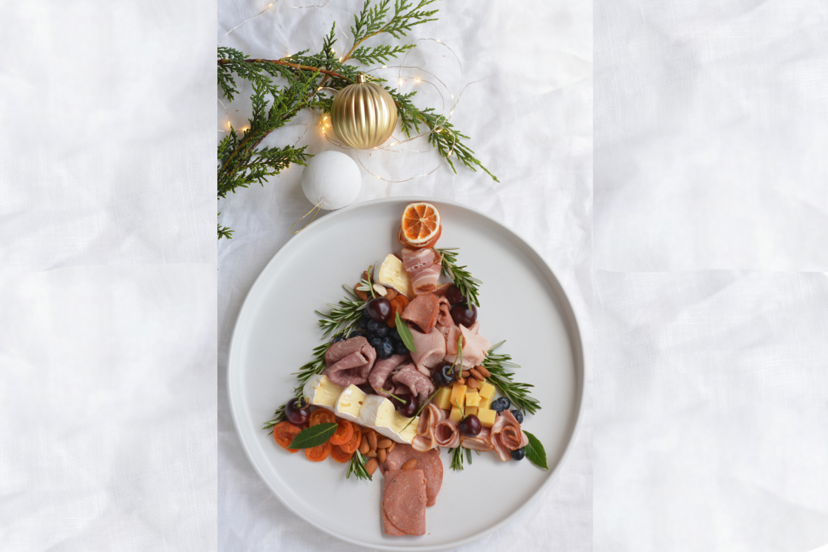 - To create the Christmas tree shape, begin by placing the salami as the trunk of the tree. Roll the remaining charcuterie into spirals and zig-zag upwards towards the top of the platter.