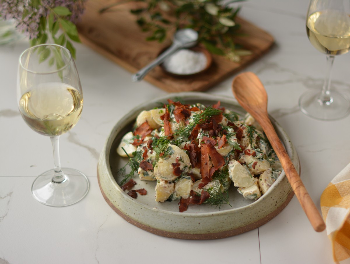 - To serve, place onto a serving platter and drizzle with red wine vinegar & Extra Virgin Olive Oil. Lightly crumble the crispy Pancetta and sprinkle it on top, then garnish with dill.