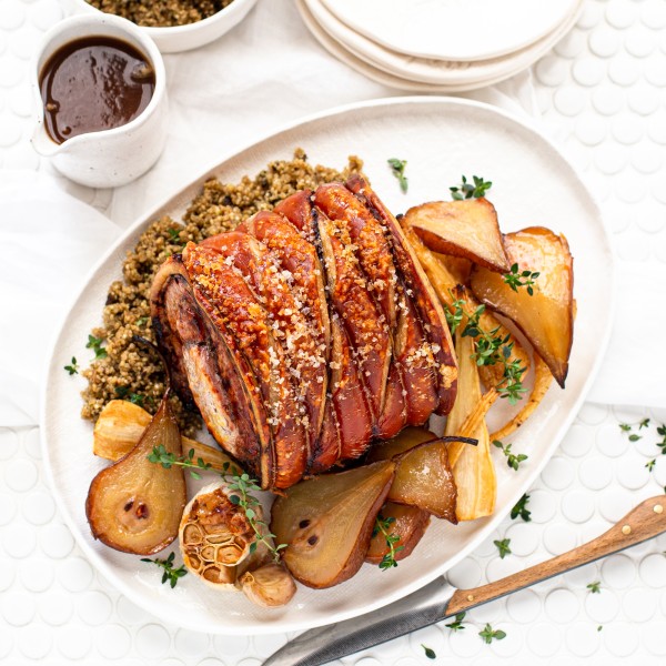 - To serve, place the quinoa and roasted pears on a large platter scatter over the thyme sprigs, add the carved roast pork loin, serve with gravy and steamed green vegetables.
